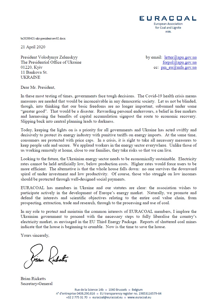 In its letter to President Zelenskyy, EURACOAL looks to the future and asks the Ukrainian government to stick with market-based solutions and electricity market liberalisation, rather than return to a failed system of central planning. As agreed in its Association Agreement with the EU, Ukraine should implement the EU Third Energy Package and did introduce the necessary legislation with a start date of 1 July 2019.